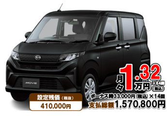 全ての車種でボーナスを均一にさせていただいていますので、33,000円(税込)のボーナスの場合には月々に5,500円(税込)を足していただければ、ボーナスなしの金額になります。
